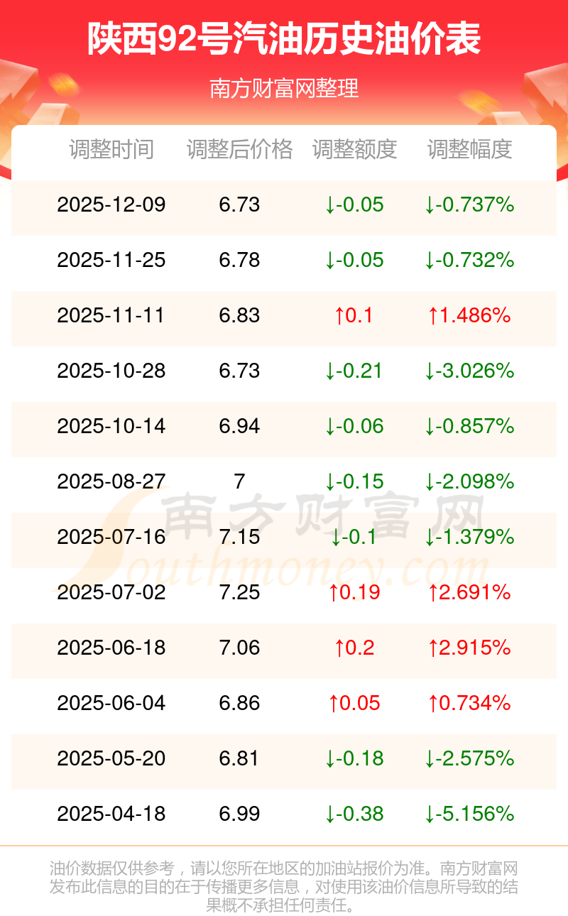 12月16日,陕西92号汽油的价格是6.73元每升,本次的调整时间为12月9日,对比上次的调整降了0.05元,降0.737%,下次调整时间为12月22日24时,还有6.7天。