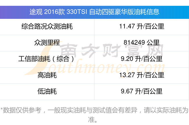 根据多位车主实测得出数据,该车型低油耗为9.67升每百公里,高油耗为13.27升每百公里,综合路况众测油耗为11.47升每百公里,工信部综合油耗为9.20升每百公里。