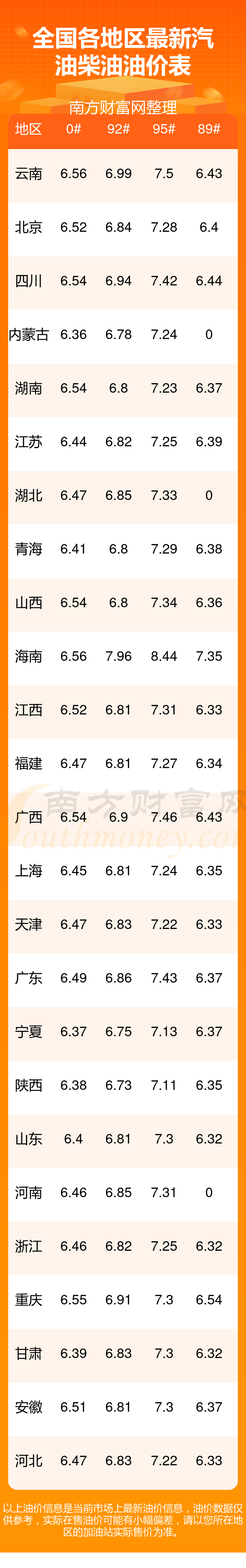 本次油价调整的时间为12月9日 ,调整后全国油价详情如下: