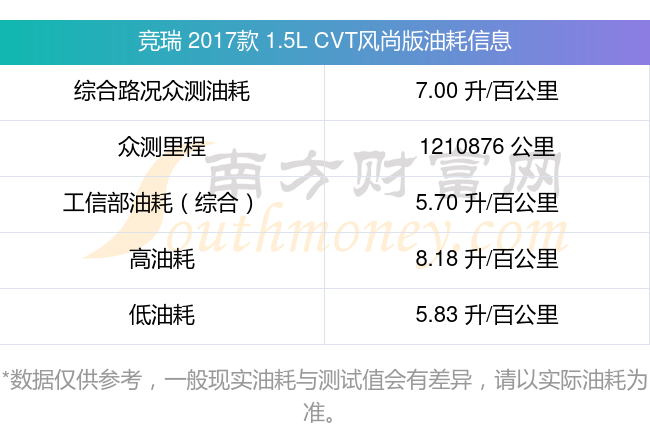 根据多位车主实测得出数据,该车型低油耗为5.83L/100km,高油耗为8.18L/100km,综合路况众测油耗为7.00L/100km,工信部综合油耗为5.70L/100km。