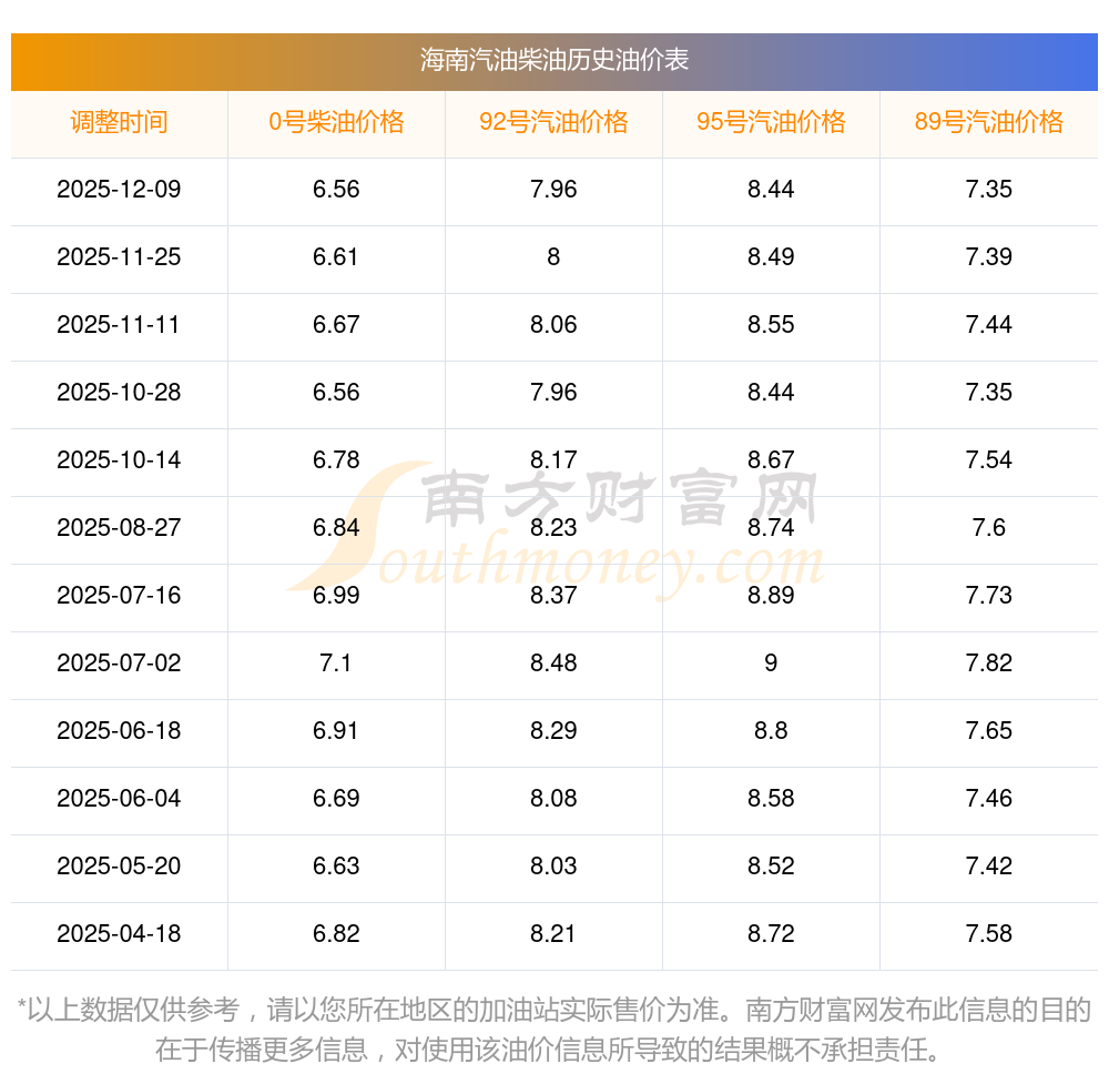 按12月9日92号汽油最新调整价格7.96元每升来计算(以海南为例),该车型百公里平均油费为55.72元,按上一轮11月25日调整价格8元每升来计算,百公里平均油费为56元,对比上一轮少花0.28元,下一轮油价调整时间为12月22日24时。
