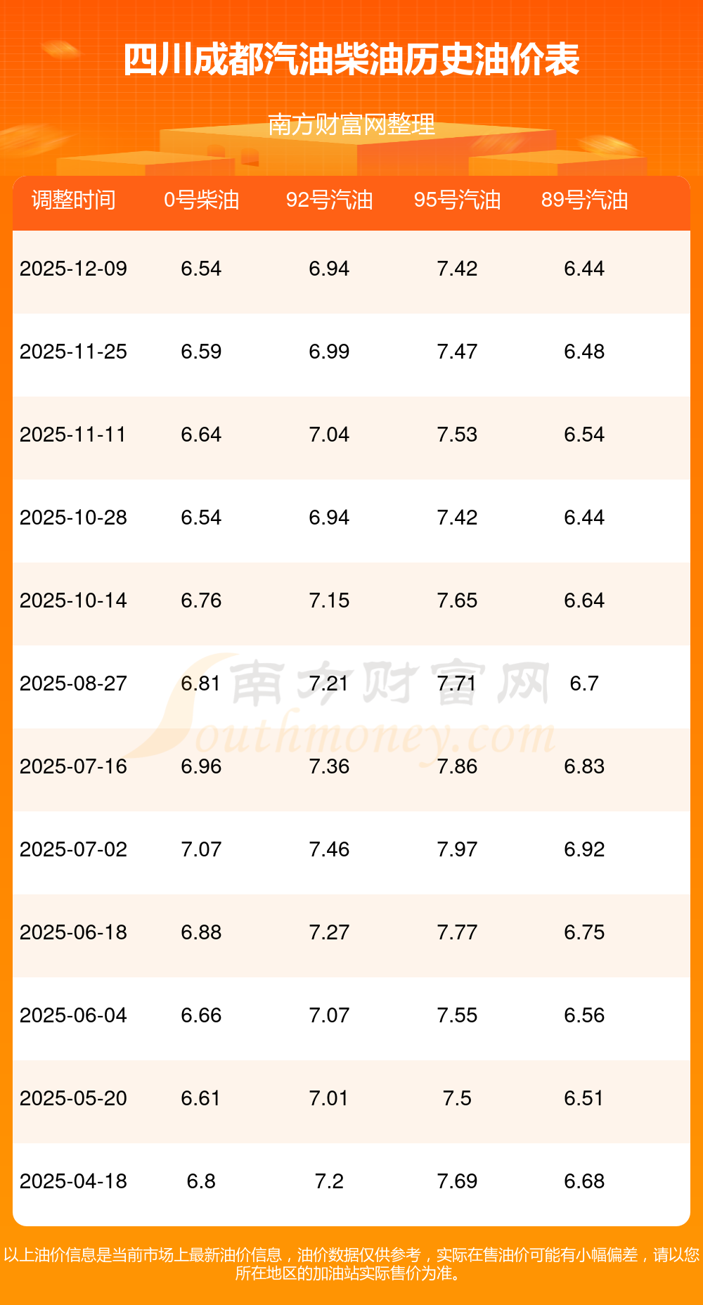 四川成都汽油柴油12月16日每升的价格为12月9日调整后的价格,各油价详情如下:92号汽油6.94元;95号汽油7.42元;89号汽油6.44元;0号柴油6.54元。