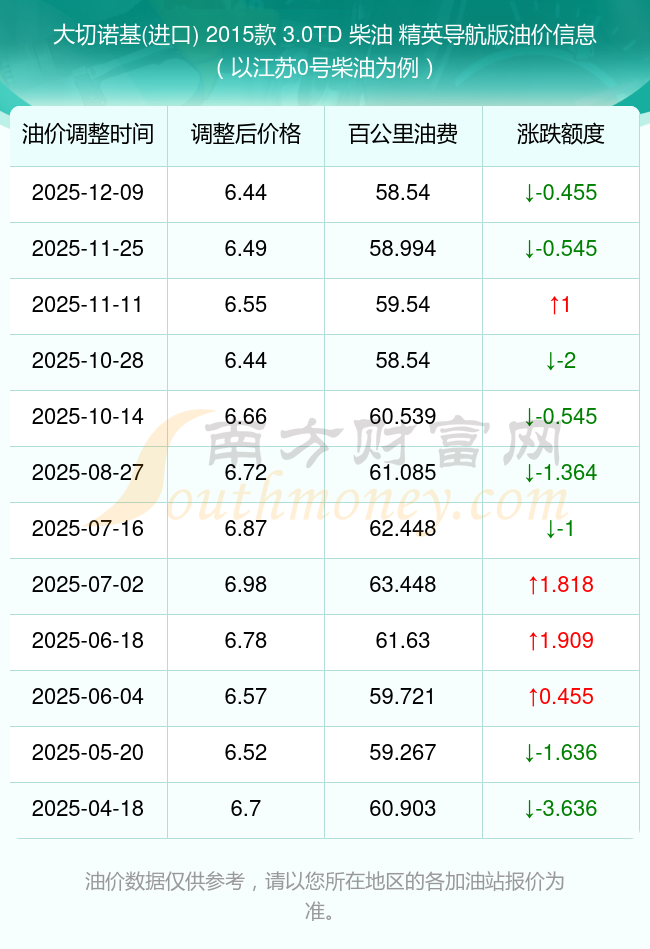 依照12月9日0号柴油最新调整价格6.44元/升来计算(以江苏为例),该车型百公里的平均油费是58.54元,依照上一轮11月25日调整价格6.49元/升来计算,百公里的平均油费是58.994元,对比上一轮少花0.455元,下一轮的油价调整时间12月22日24时。