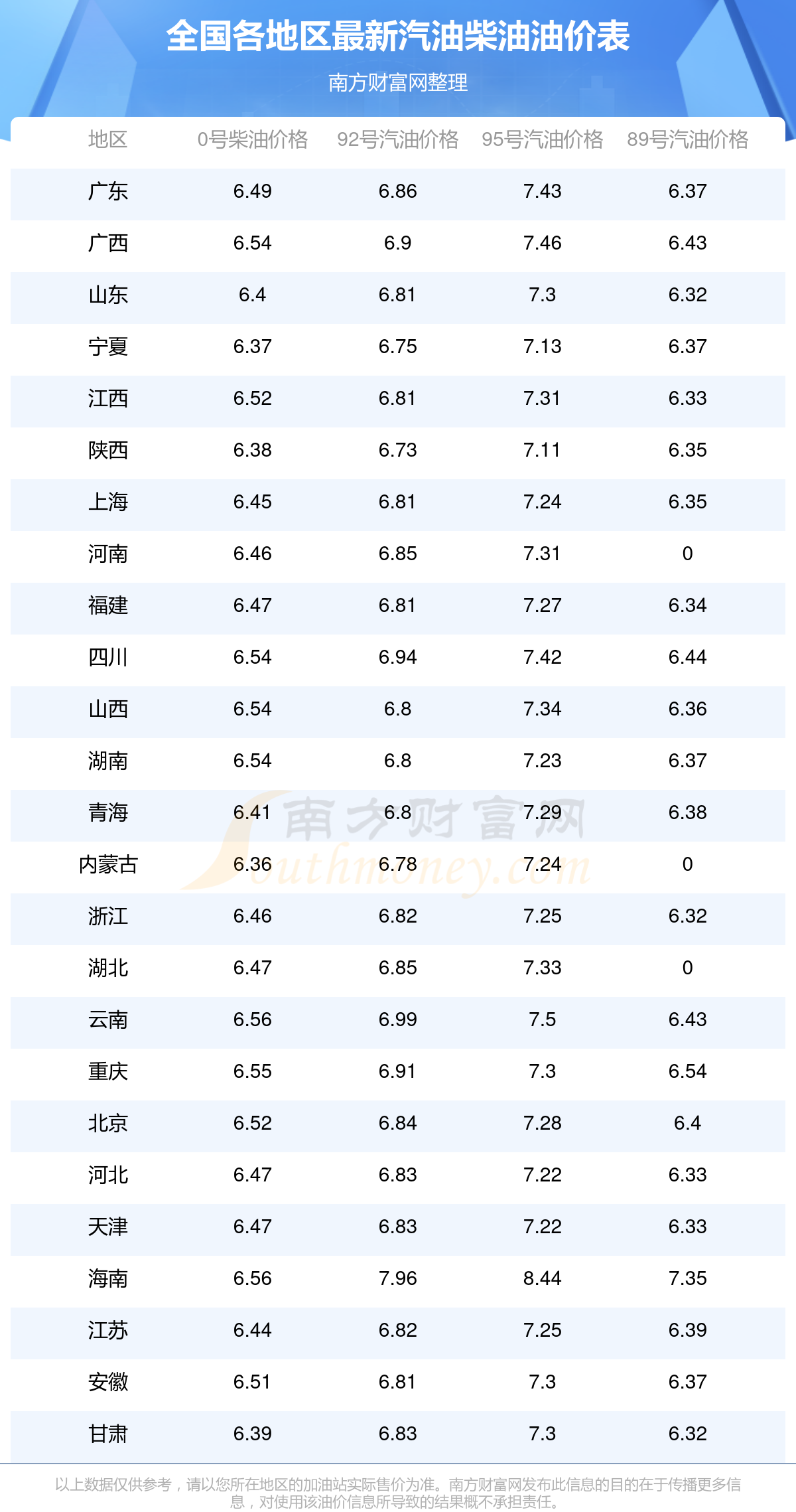 以上数据仅供参考,请以您所在地区的加油站实际售价为准。南方财富网发布此信息的目的在于传播更多信息,对使用该油价信息所导致的结果概不承担责任。