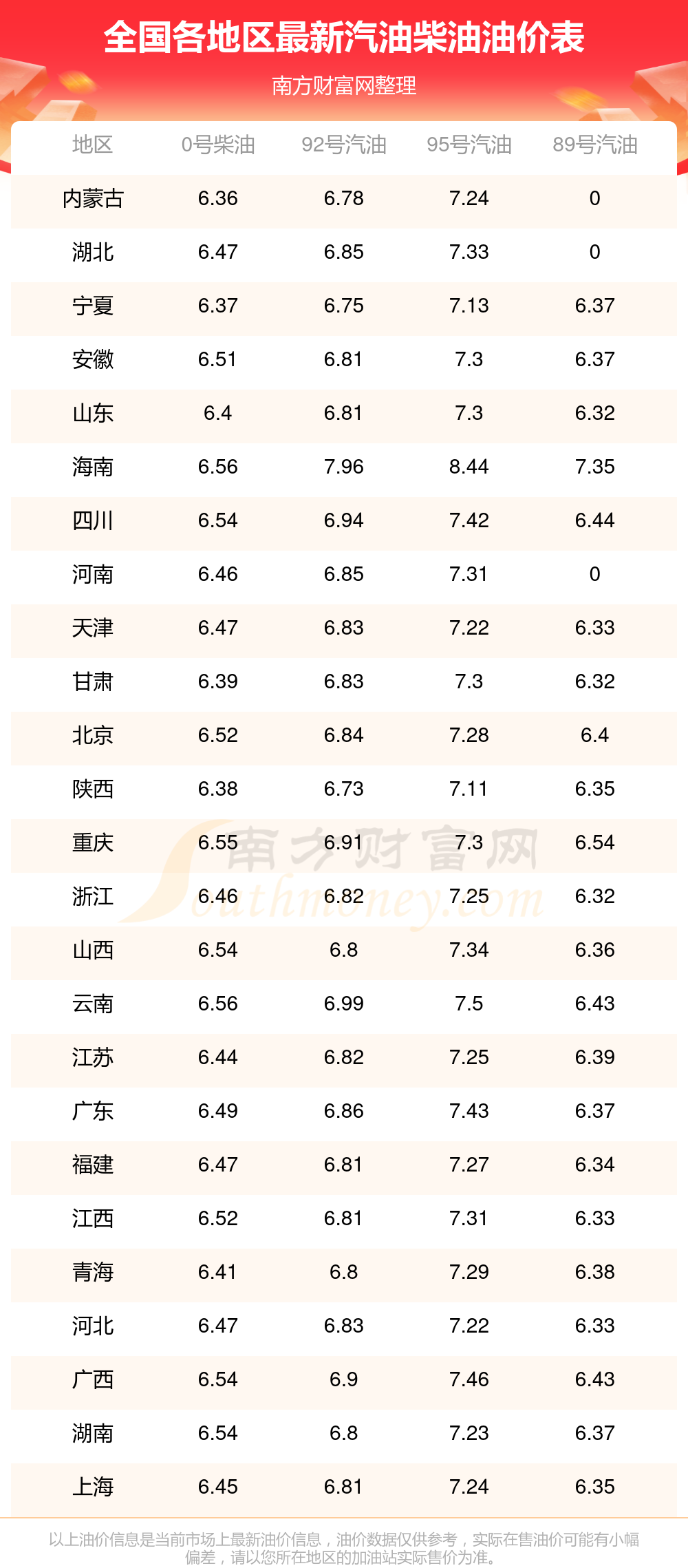 0号柴油平均价格:6元每升,其中,最高为海南,价格为6.56元/升,最低为内蒙古,价格为6.36元/升。