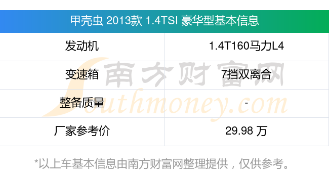 甲壳虫 2013款 1.4TSI 豪华型动力上搭载的是一台1.4T160马力L4机械+涡轮增压发动机,匹配7挡双离合自动档变速箱,燃料形式为汽油,厂家参考价29.98万元。