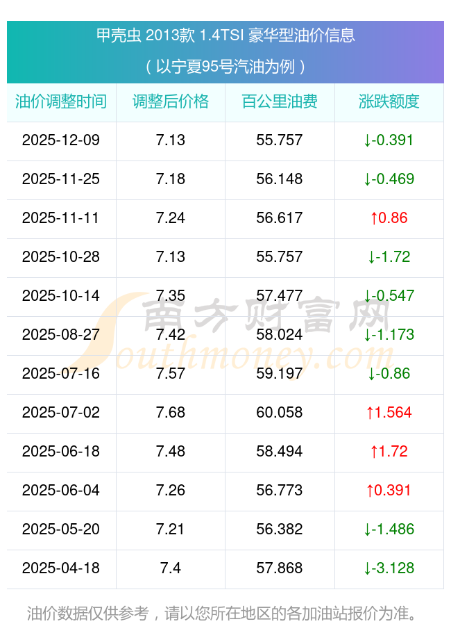 按12月9日95号汽油最新调整价格7.13元每升来计算(以宁夏为例),该车型百公里平均油费为55.757元,按上一轮11月25日调整价格7.18元每升来计算,百公里平均油费为56.148元,对比上一轮少花0.391元,下一轮油价调整时间为12月22日24时。