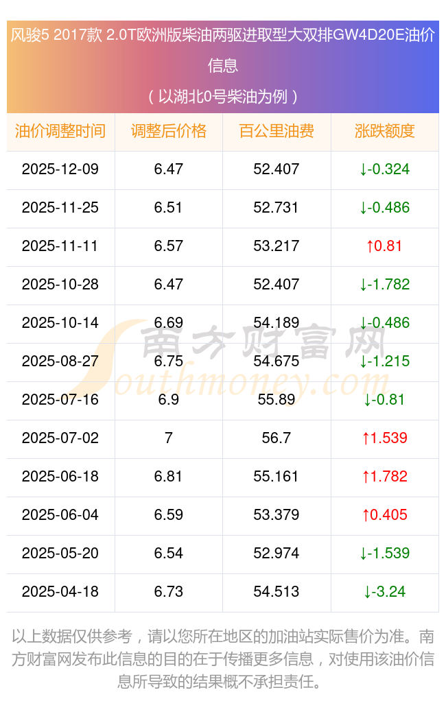 按照12月9日0号柴油最新调整价格6.47元/升来计算(以湖北为例),该车型百公里平均油费为52.407元,按照上一轮11月25日调整价格6.51元/升来计算,百公里平均油费为52.731元,对比上一轮少花0.324元,下一轮油价调整时间为12月22日24时。