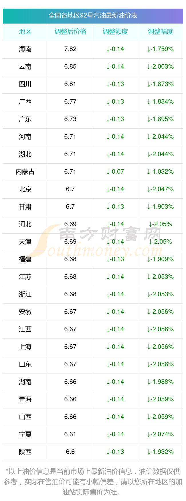 以上数据仅供参考,请以您所在地区的加油站实际售价为准。南方财富网发布此信息的目的在于传播更多信息,对使用该油价信息所导致的结果概不承担责任。