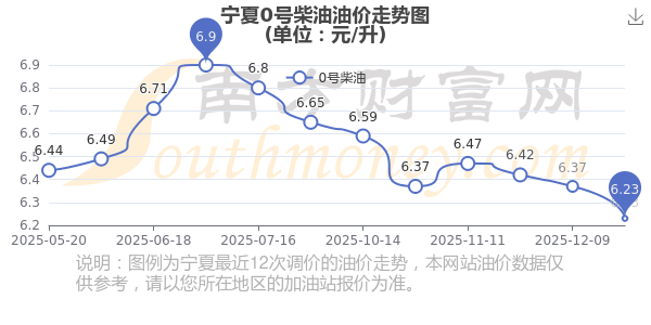 12月29日,宁夏0号柴油的价格是6.23元每升,本次的调整时间为12月23日,对比上次的调整减了0.14元,减2.198%,12月31日24时为下一轮油价调整时间,还有0天。