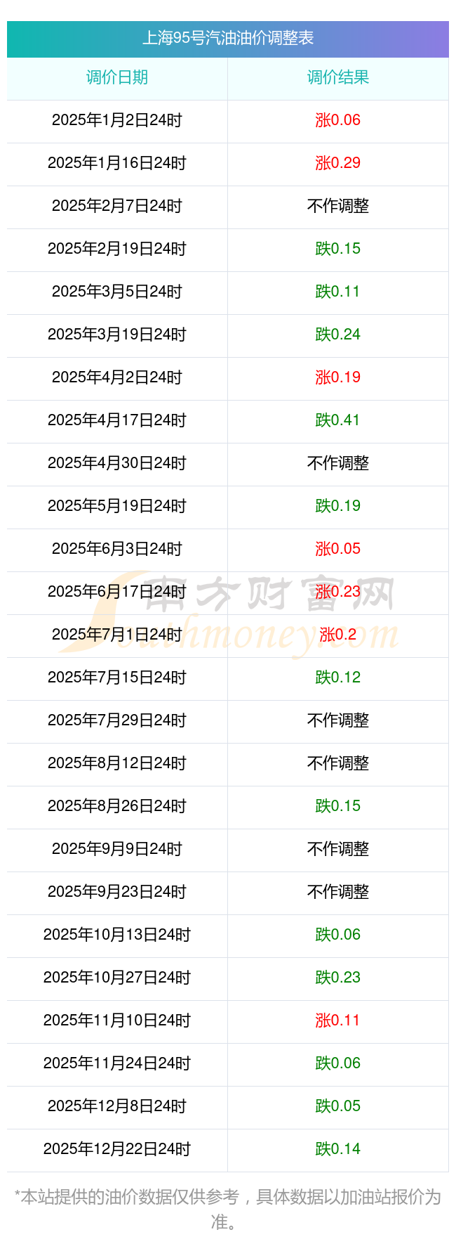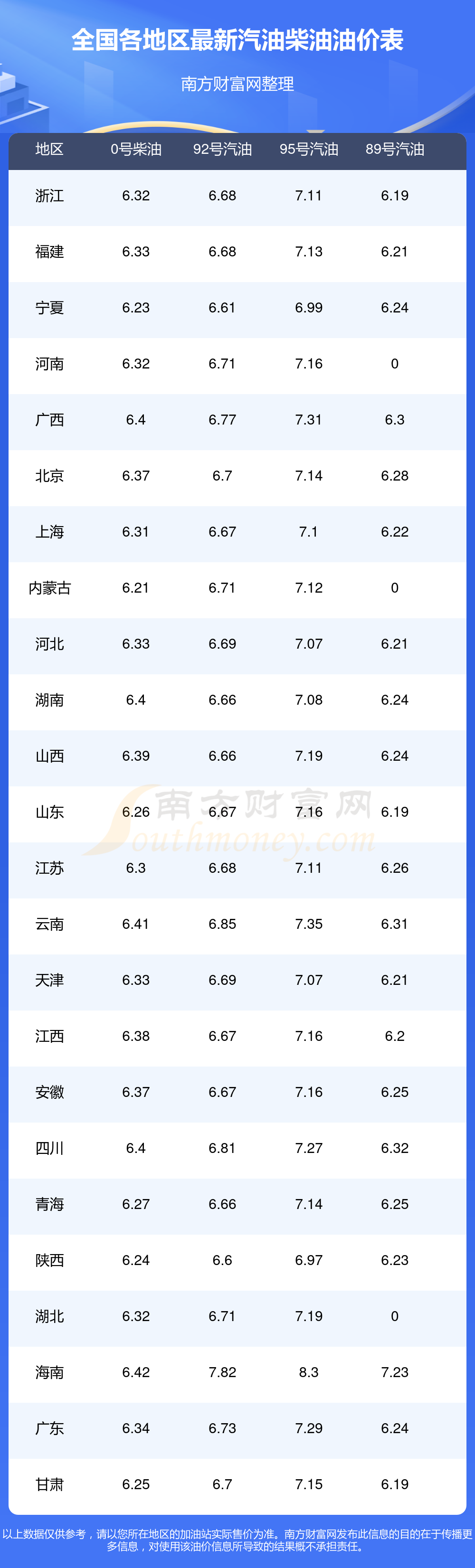 油价数据仅供参考,请以您所在地区的加油站报价为准。南方财富网发布此信息的目的在于传播更多信息,对使用该油价信息所导致的结果概不承担任何责任。