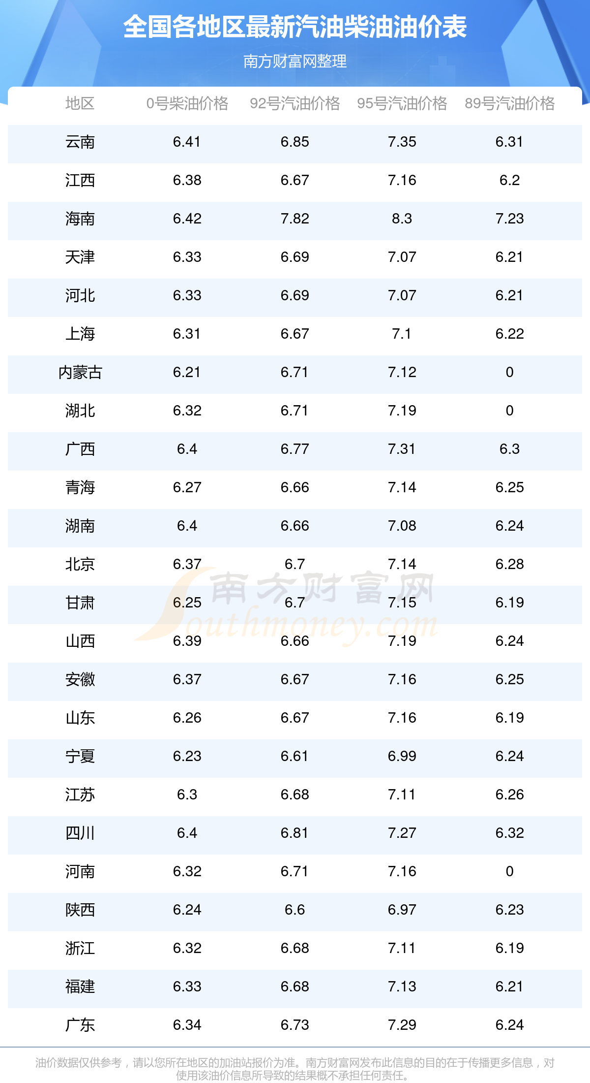 以上油价信息是当前市场上最新油价信息,油价数据仅供参考,实际在售油价可能有小幅偏差,请以您所在地区的加油站实际售价为准。