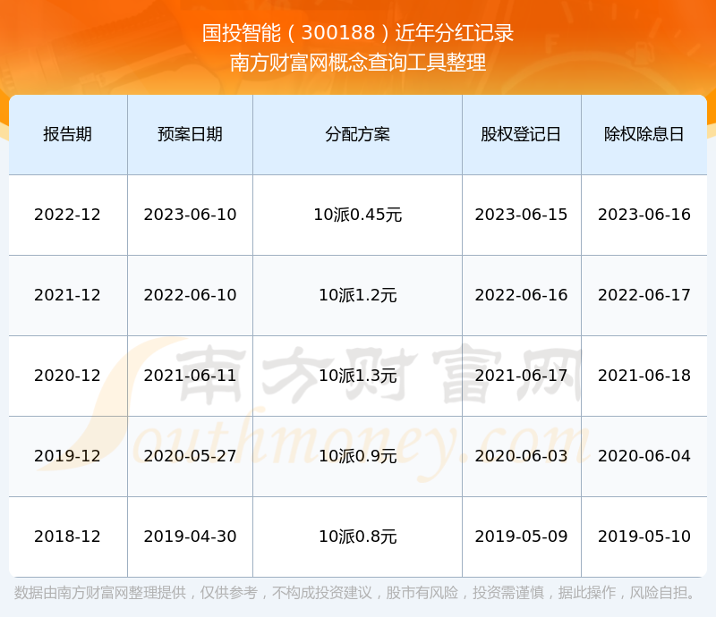 国投智能最新一次公布的分红方案为10派0.45元。本次权益分派股权登记日为2023年6月15日,除权除息日为2023年6月16日,派息日为2023年6月16日。