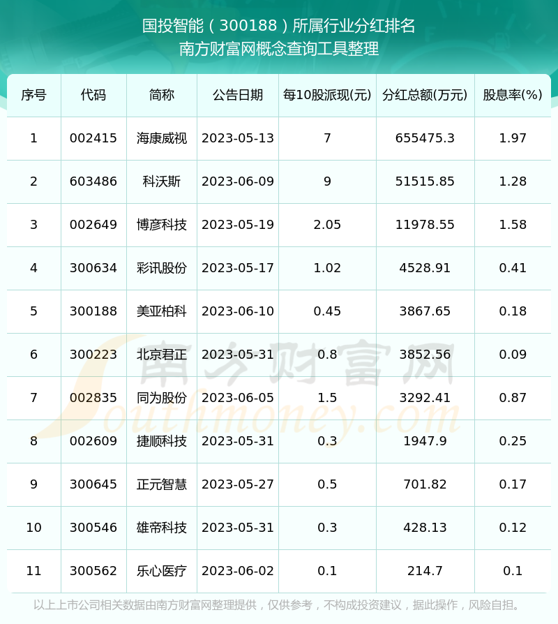 按照南方财富网趋势选股系统统计,国投智能所属行业为软件开发行业,软件开发行业分红排名情况如下表: