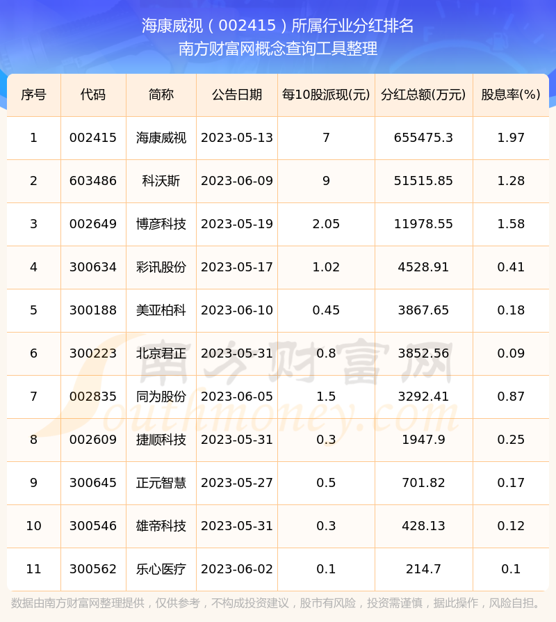 按照南方财富网趋势选股系统统计,海康威视所属行业为计算机设备行业,计算机设备行业分红排名情况如下表:
