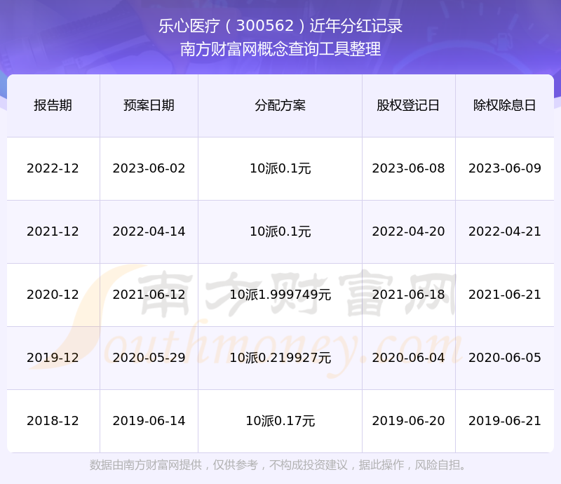 乐心医疗最新一次公布的分红方案为10派0.1元。本次权益分派股权登记日为2023年6月8日,除权除息日为2023年6月9日,派息日为2023年6月9日。