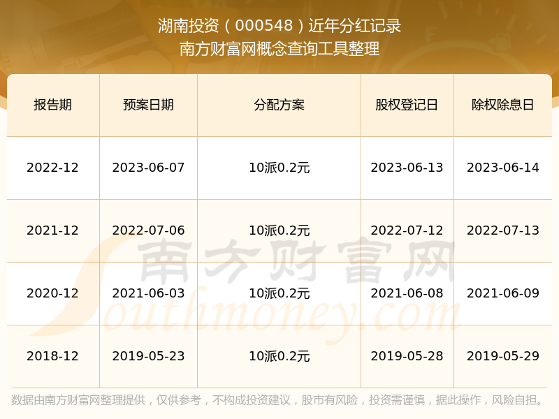 湖南投资最新一次公布的分红方案为10派0.2元。本次权益分派股权登记日为2023年6月13日,除权除息日为2023年6月14日,派息日为2023年6月14日。