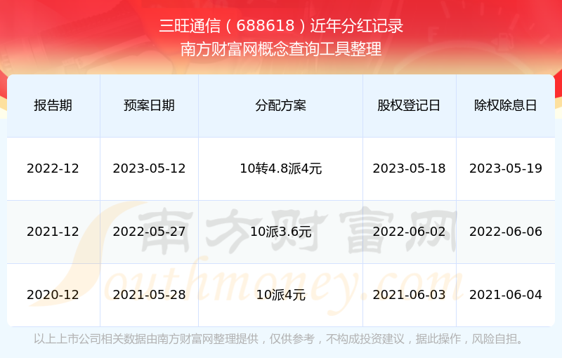 三旺通信最新一次公布的分红方案:10转4.8派4元。