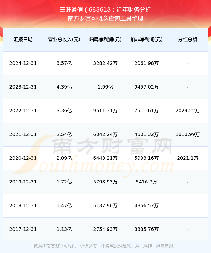 2024年报显示,三旺通信实现营收3.57亿,同比增长-18.79%;净利润3282.42万,同比增长-69.98%;毛利率60.53%。