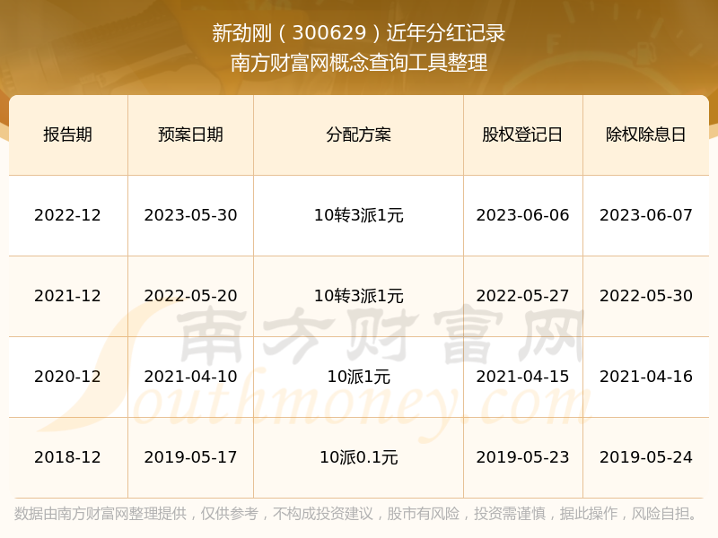 新劲刚最新一次公布的分红方案为10转3派1元。本次权益分派股权登记日为2023年6月6日,除权除息日为2023年6月7日,派息日为2023年6月7日。