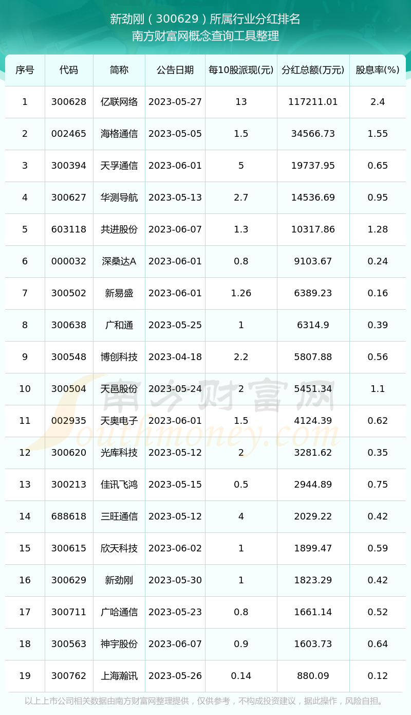按照南方财富网趋势选股系统统计,新劲刚所属行业为通信设备行业,通信设备行业分红排名情况如下表:
