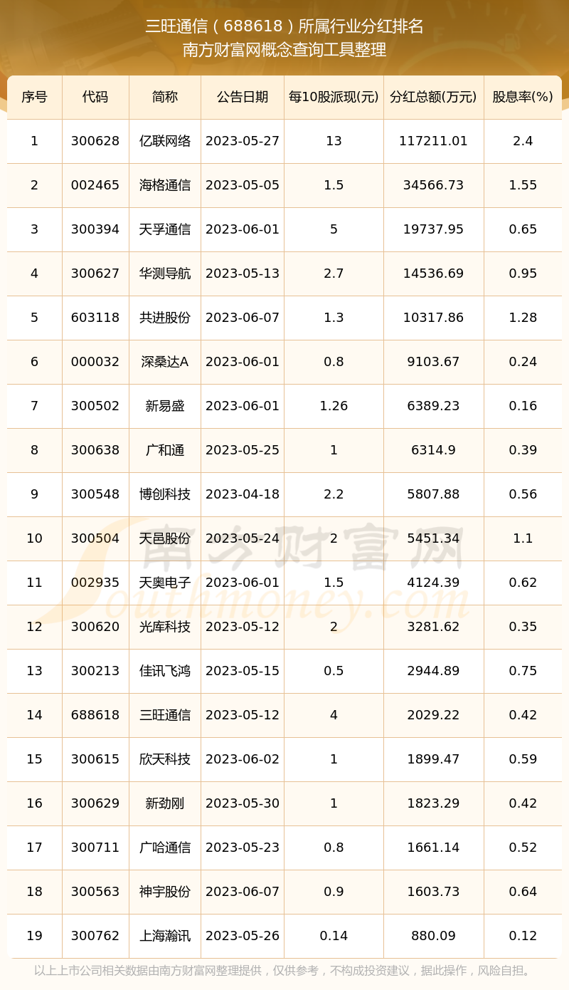 二、三旺通信688618行业分红排名