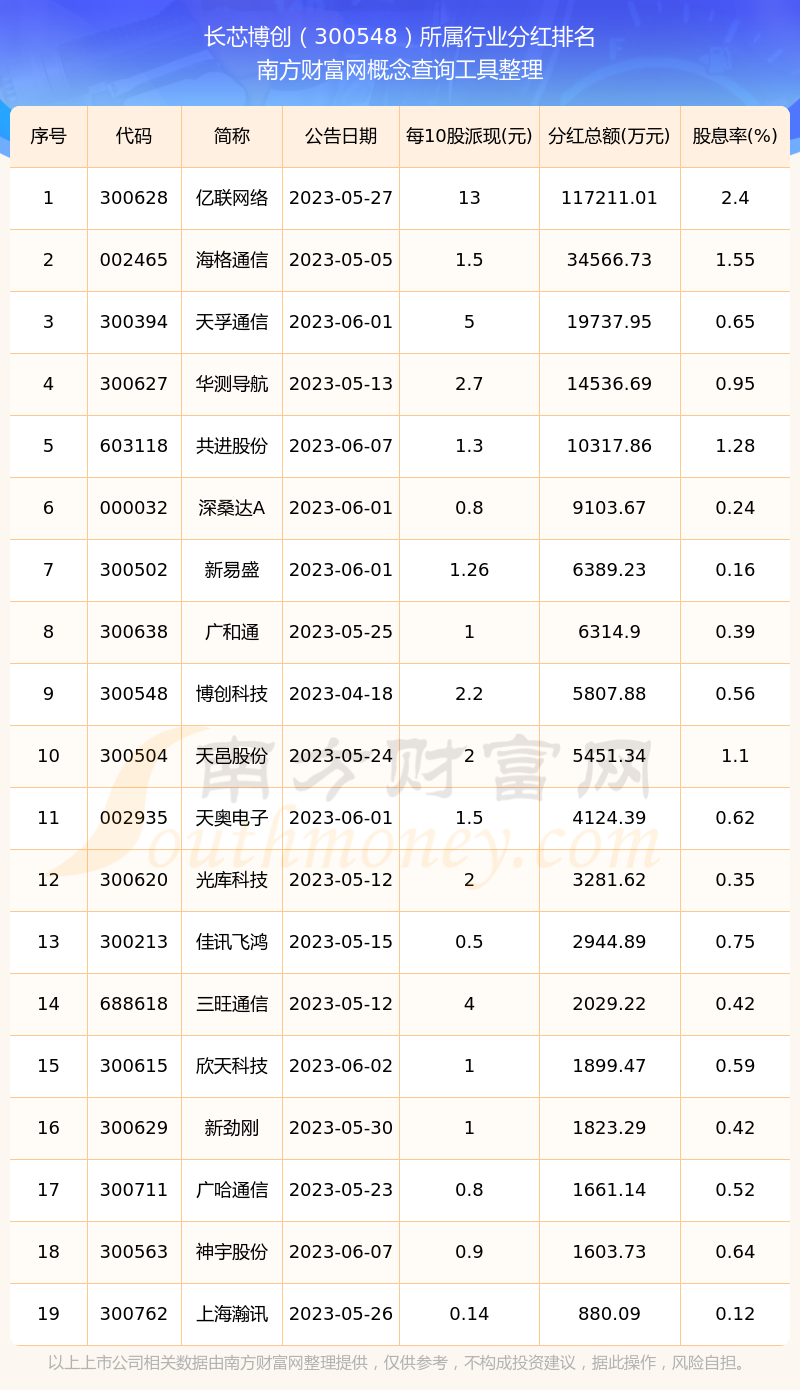 按照南方财富网趋势选股系统统计,长芯博创所属行业为光纤行业,光纤行业分红排名情况如下表: