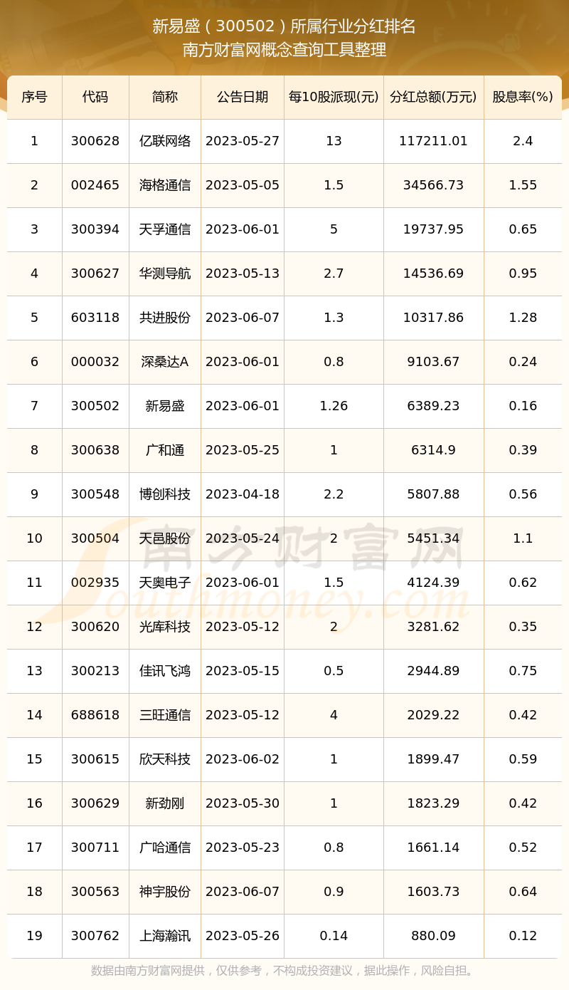 按照南方财富网趋势选股系统统计,新易盛所属行业为通信设备行业,通信设备行业分红排名情况如下表: