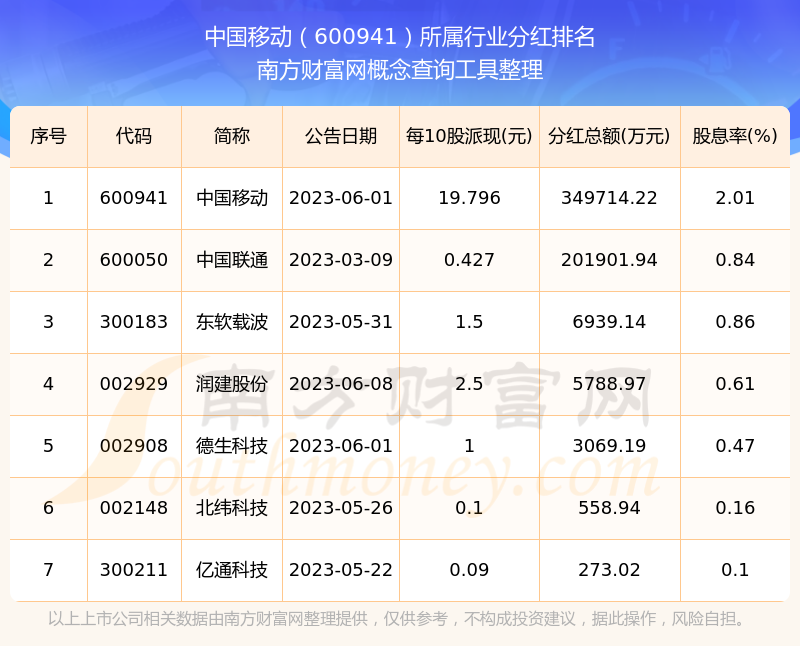 按照南方财富网趋势选股系统统计,中国移动所属行业为通信服务行业,通信服务行业分红排名情况如下表: