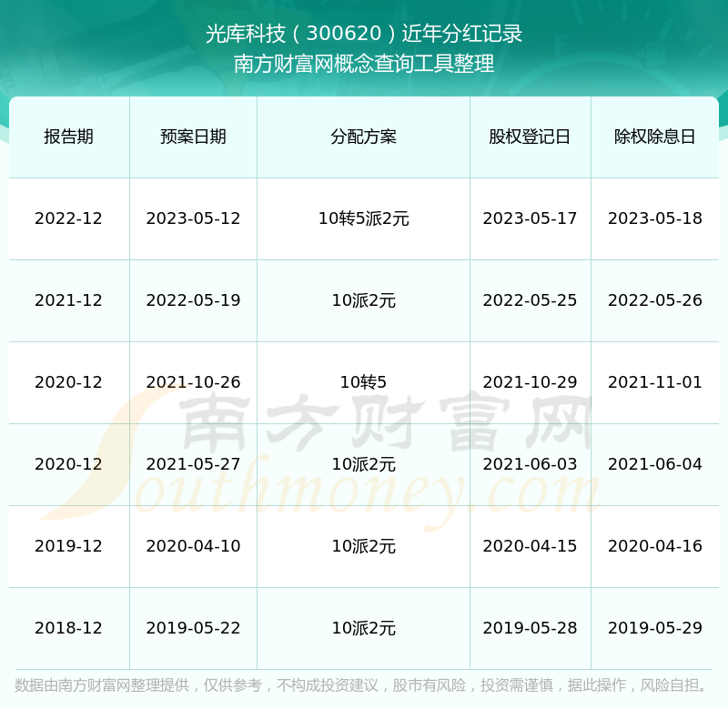 光库科技最新一次公布的分红方案为10转5派2元。本次权益分派股权登记日为2023年5月17日,除权除息日为2023年5月18日,派息日为2023年5月18日。