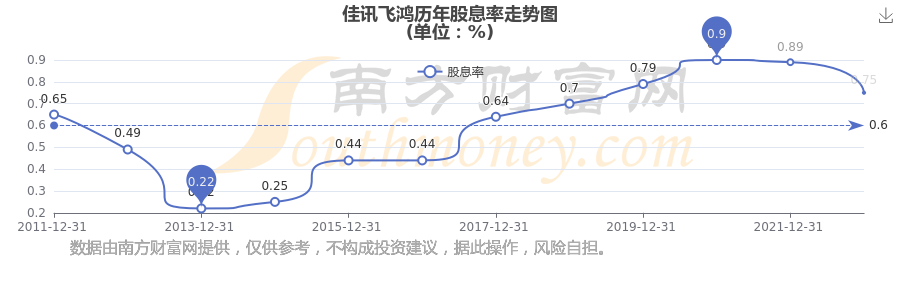 佳讯飞鸿最新一次公布的分红方案为10派0.5元。本次权益分派股权登记日为2023年5月22日,除权除息日为2023年5月23日,派息日为2023年5月23日。