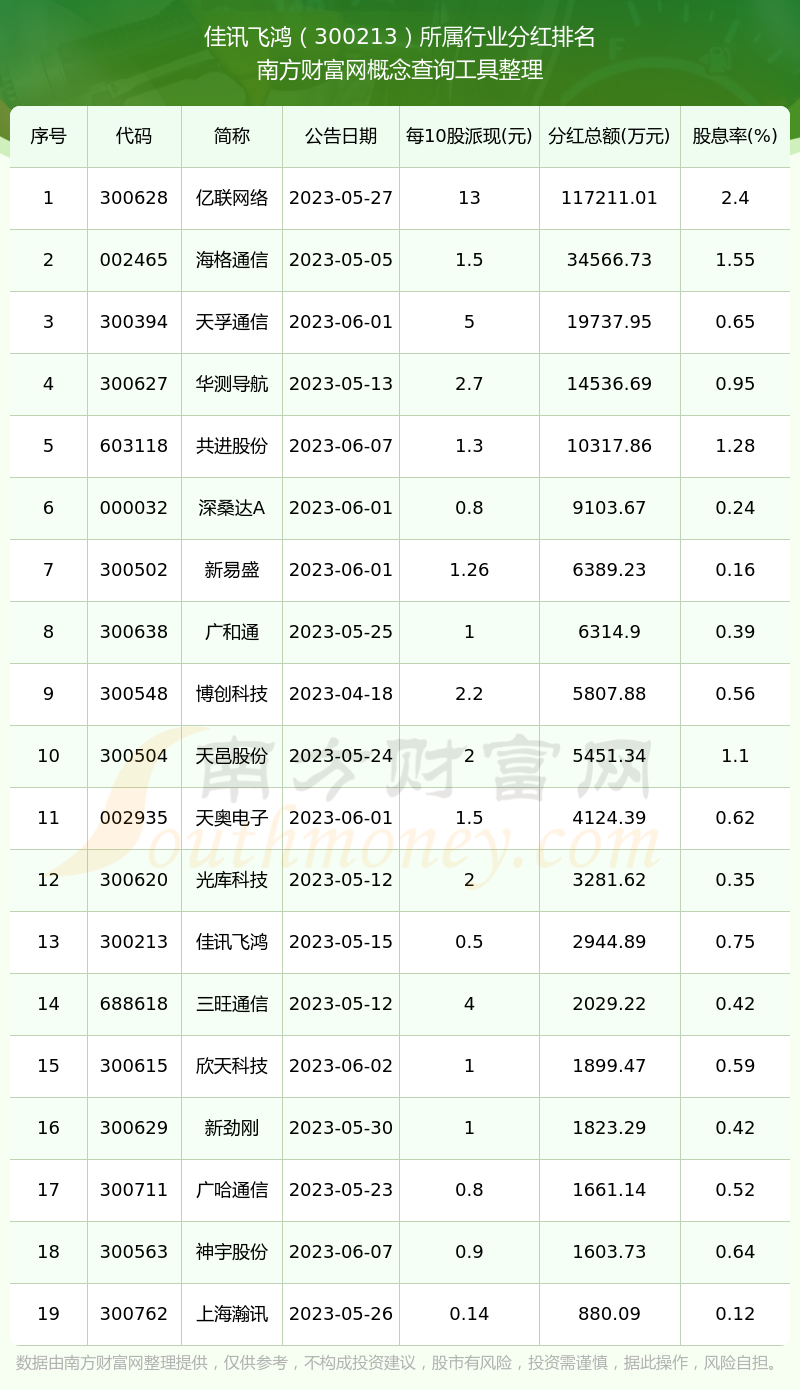 按照南方财富网趋势选股系统统计,佳讯飞鸿所属行业为通信设备行业,通信设备行业分红排名情况如下表: