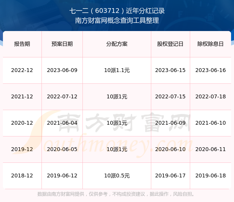 近年七一二分红派息情况如下表所示: