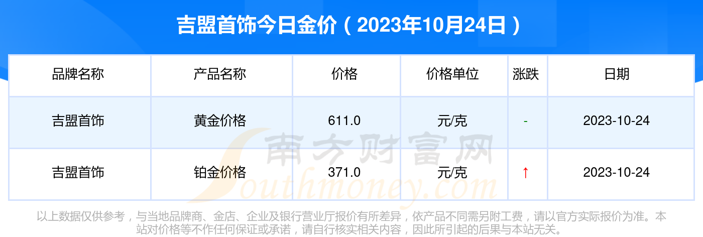 2023年10月24日吉盟首饰金价查询:黄金价格611.0元/克,铂金价格371.0元/克。
