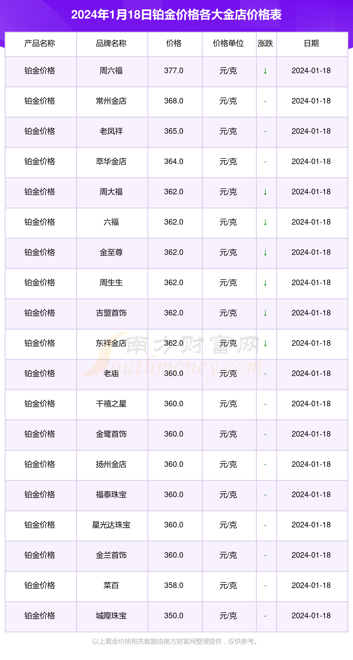 2024年1月18日,周大福、老凤祥、周六福、六福、菜百、老庙、金至尊、周生生、千禧之星、吉盟首饰、金鹭首饰等各大金店品牌铂金价格今日价格如下:周大福362.0元/克、老凤祥365.0元/克、周六福377.0元/克、六福362.0元/克、菜百358.0元/克、老庙360.0元/克、金至尊362.0元/克、周生生362.0元/克、千禧之星360.0元/克、吉盟首饰362.0元/克、金鹭首饰360.0元/克。