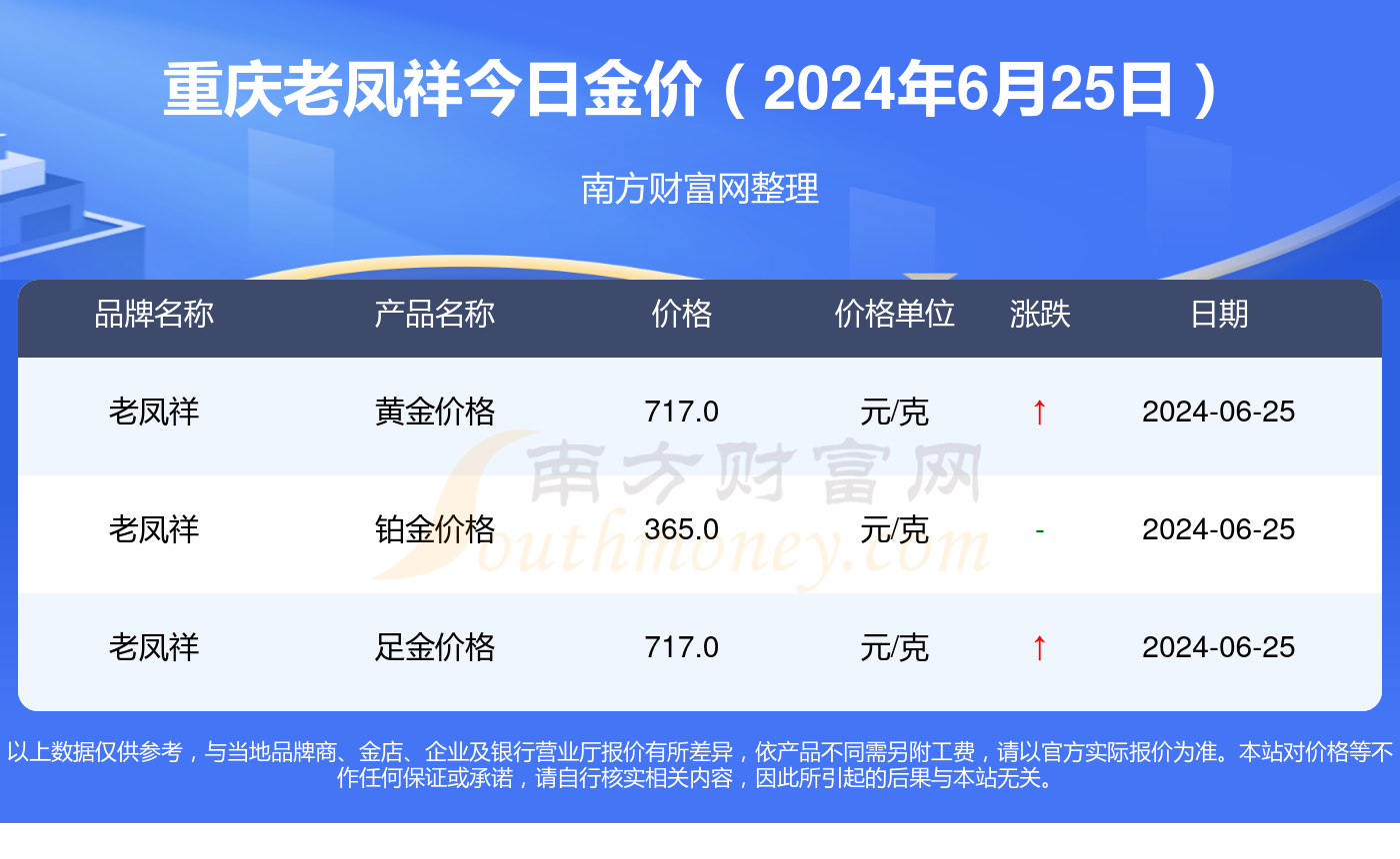 2024年6月25日重庆老凤祥今日价格:黄金价格717.0元/克,铂金价格365.0元/克,足金价格717.0元/克。