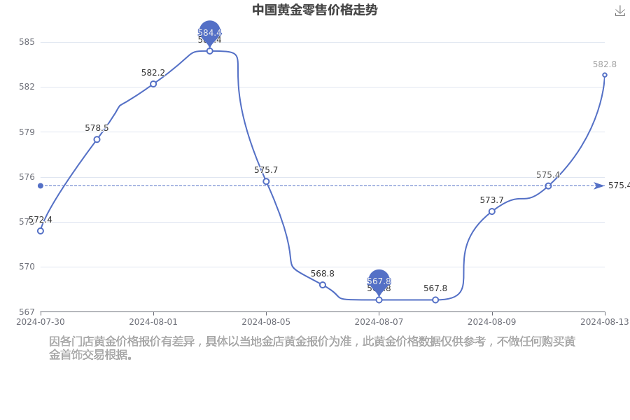 今日中国黄金零售价格为582.8元/克。
