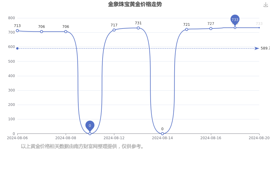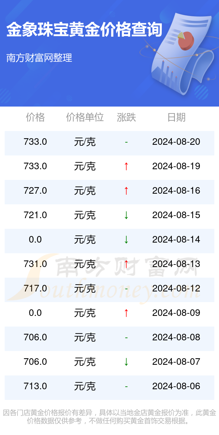 今日(2024年8月20日)金象珠宝黄金价格:733.0元/克。