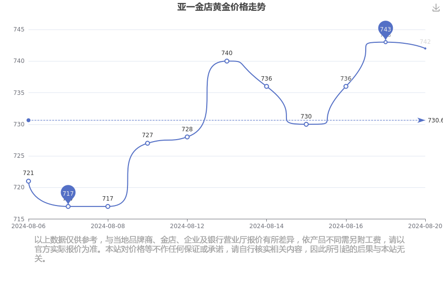 今日(2024年8月20日)亚一金店黄金价格为742.0元/克。