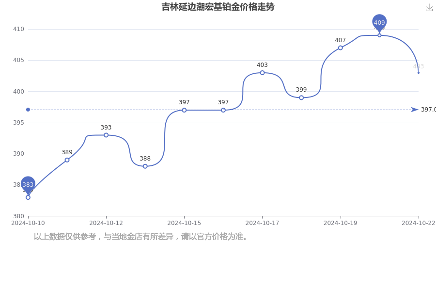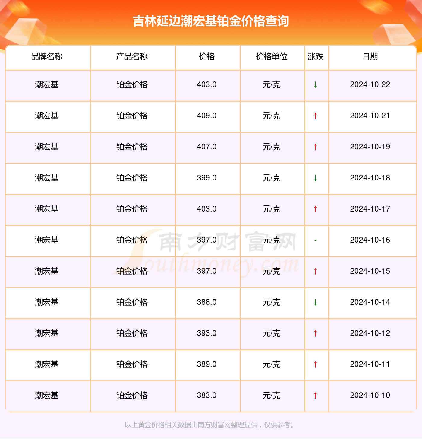 今日(2024年10月22日)吉林延边潮宏基铂金价格是403.0元/克。