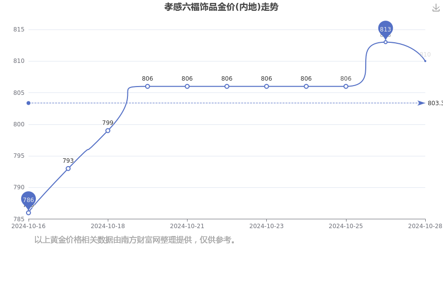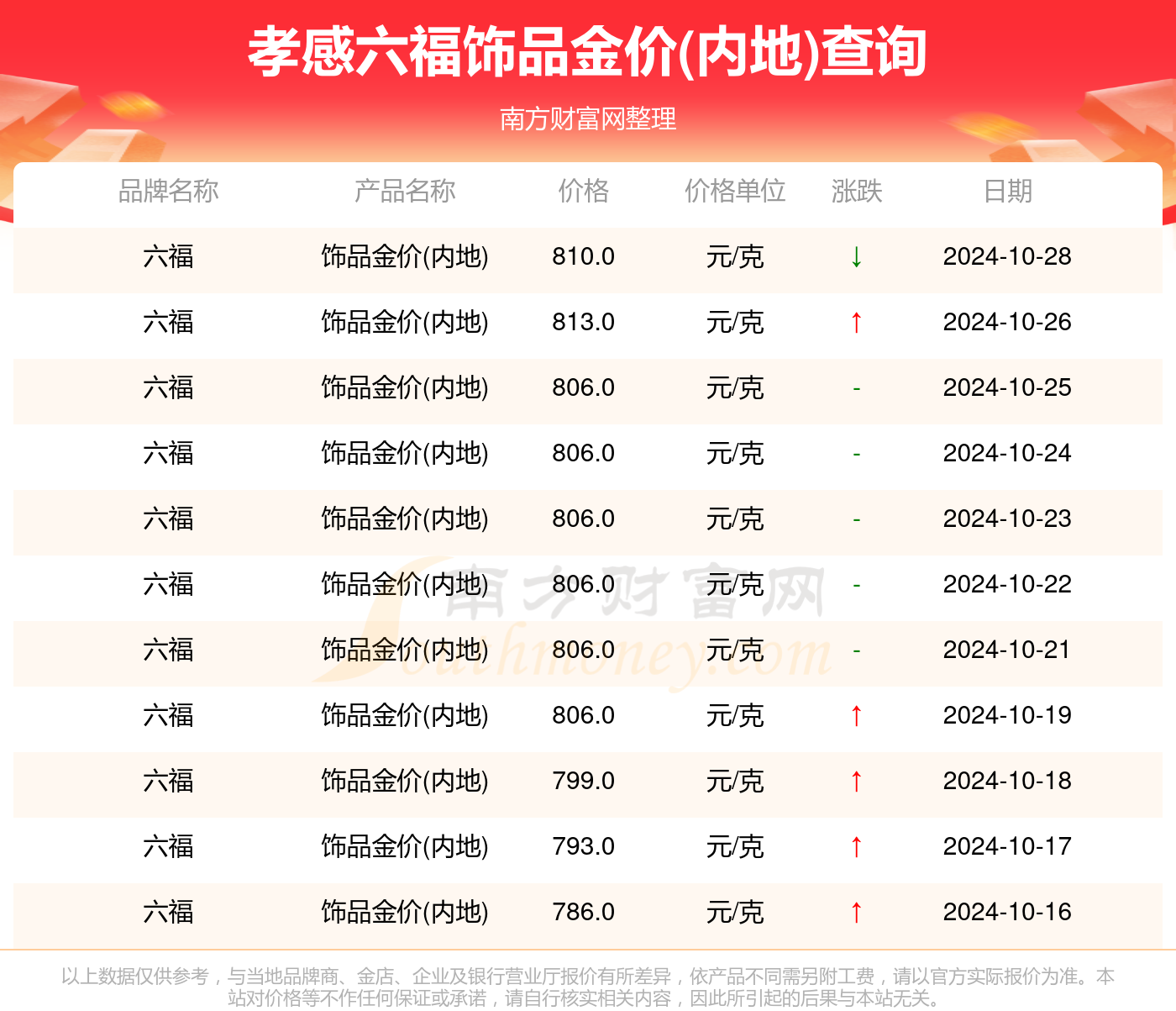 今日(2024年10月28日)孝感六福饰品金价(内地):810.0元/克。