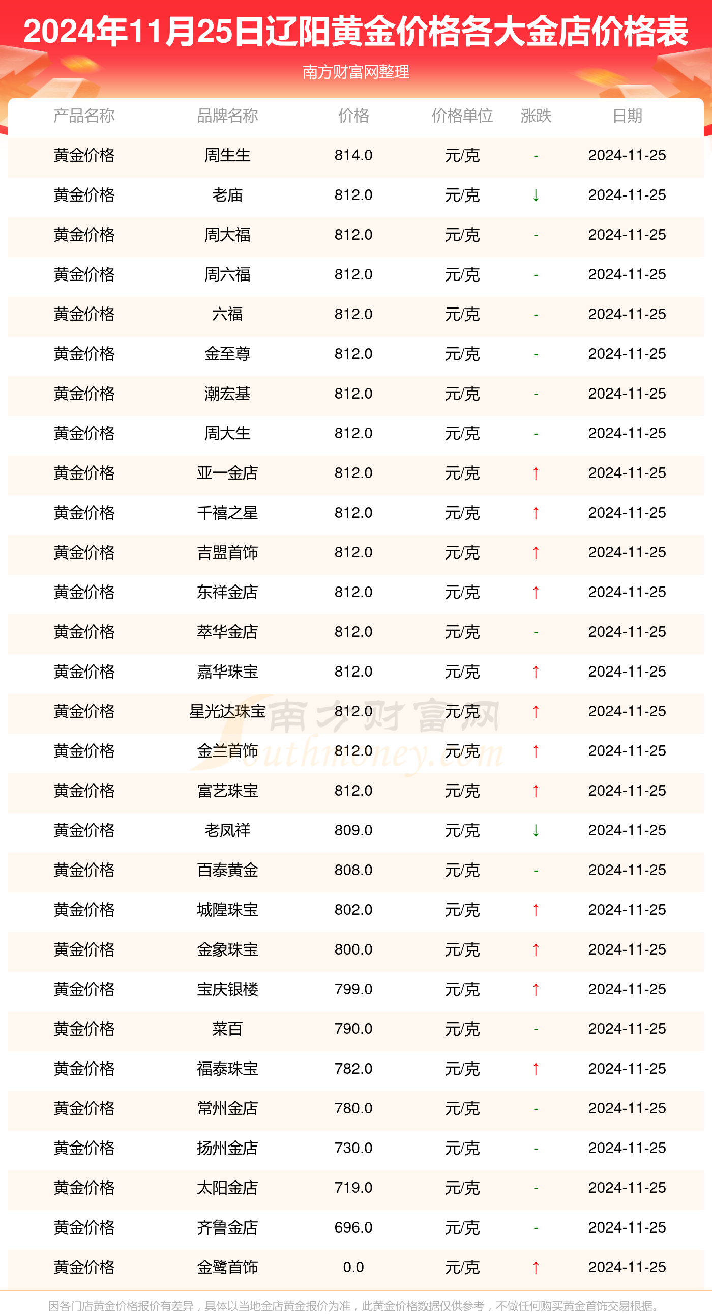 今日黄金价格多少一克_2024年11月25日辽阳各金店黄金价格表