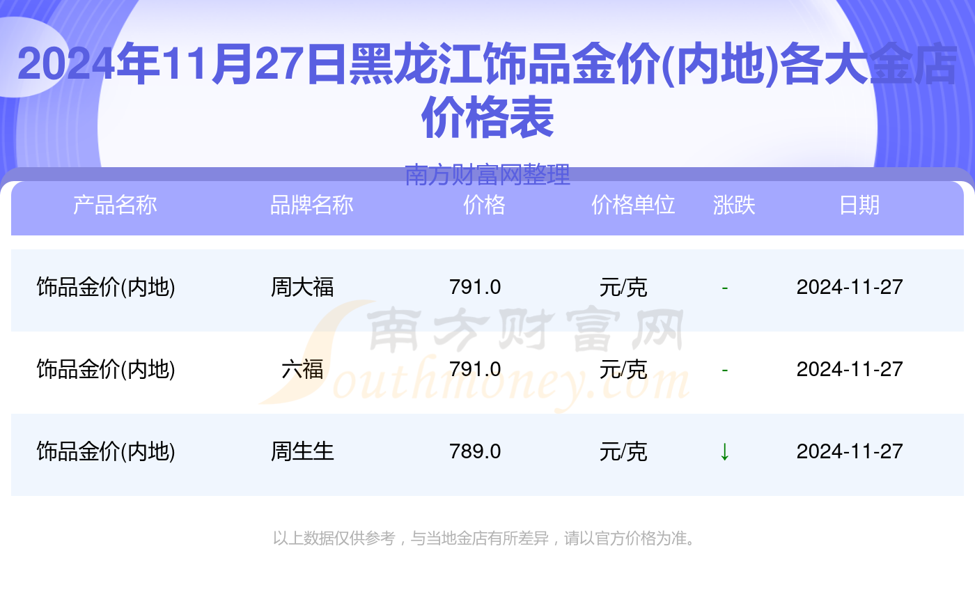 2024年11月27日黑龙江各大金店饰品金价(内地)查询