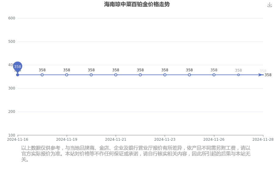 今日(2024年11月28日)海南琼中菜百铂金价格为358.0元/克。