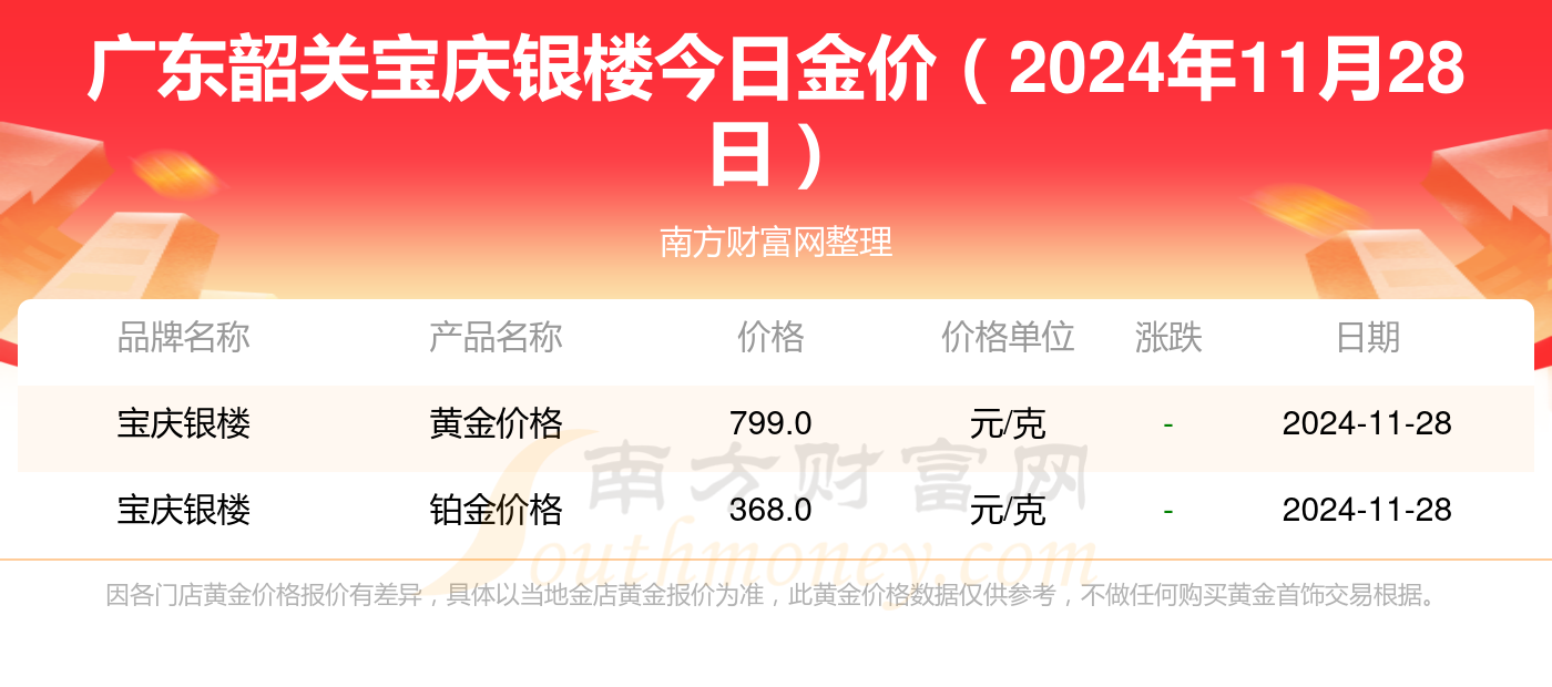 2024年11月28日广东韶关宝庆银楼最新价格:黄金价格799.0元/克,铂金价格368.0元/克。