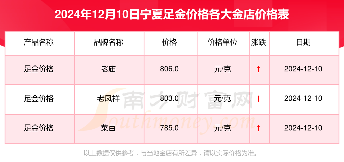 2024年12月10日宁夏各金店足金价格表(今日足金价格查询)