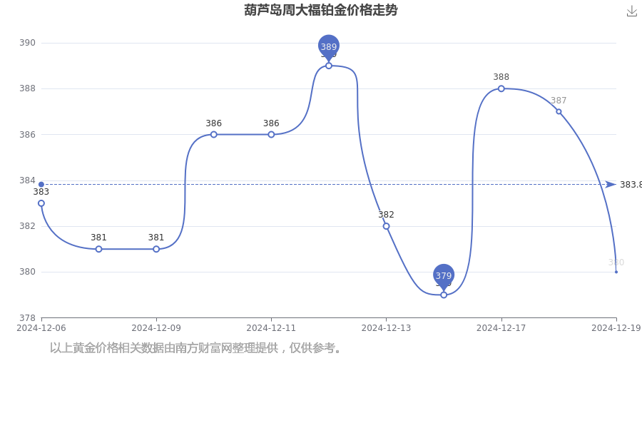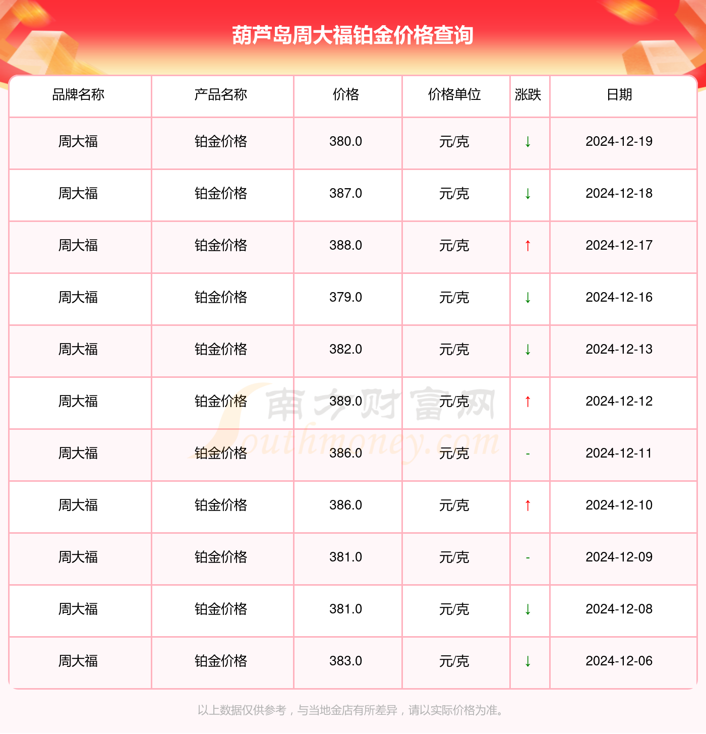 今日(2024年12月19日)葫芦岛周大福铂金价格为380.0元/克。