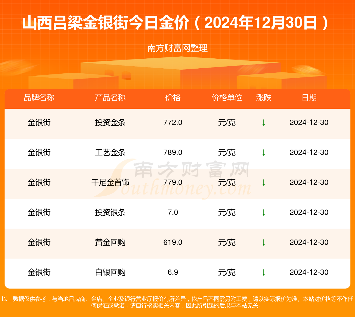 2024年12月30日山西吕梁金银街今日金价(多少钱一克)