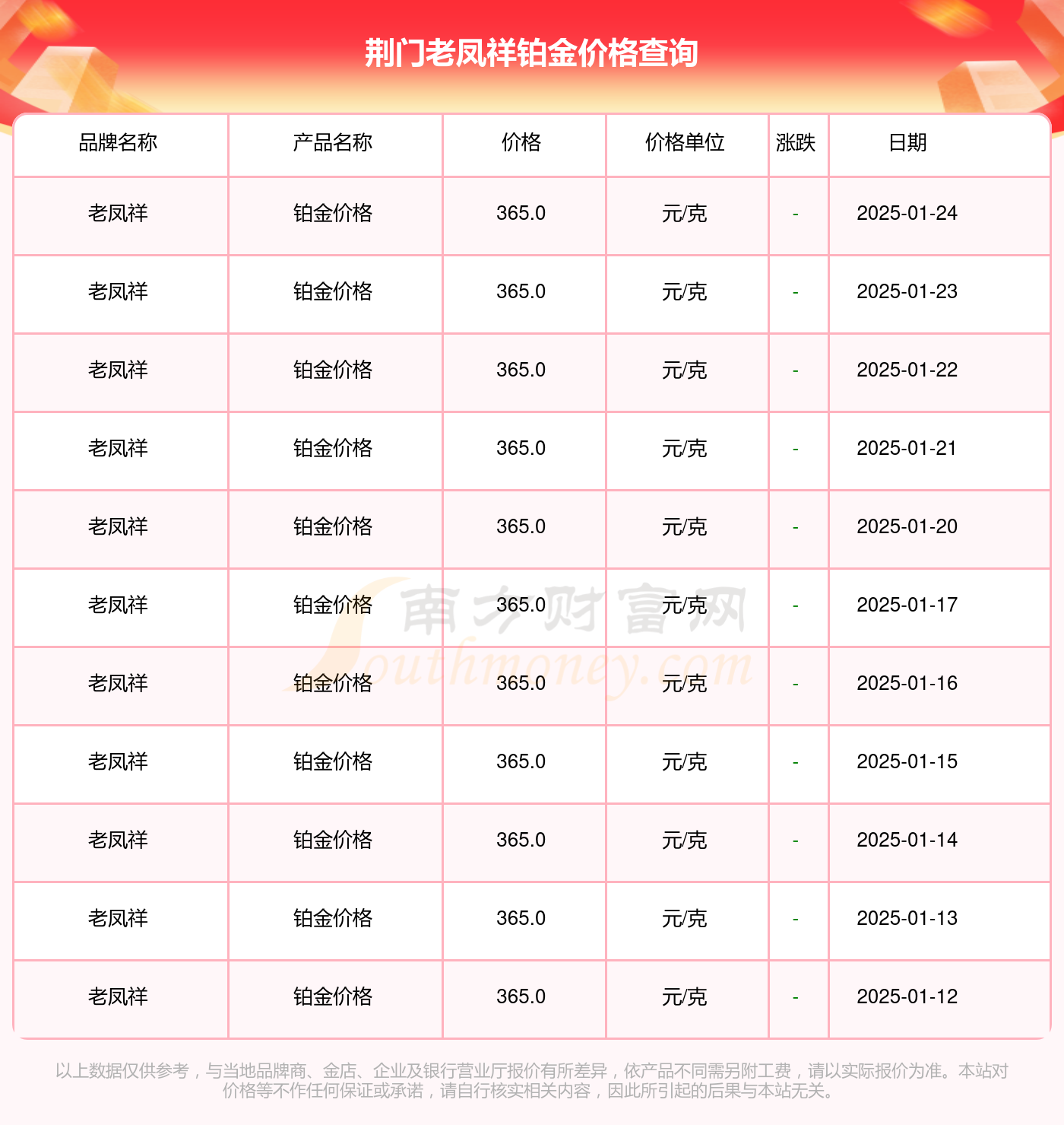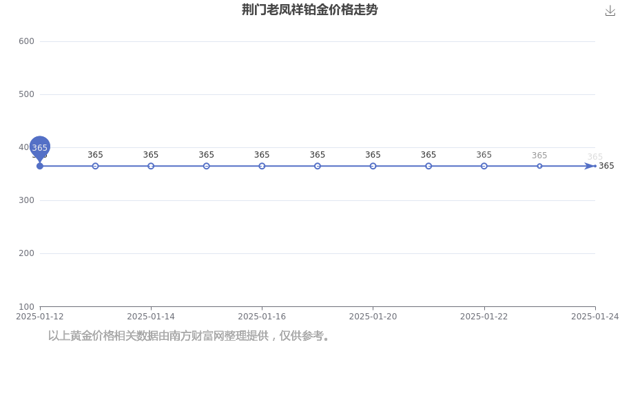 2025年1月25日荆门老凤祥铂金价格:365.0元/克。