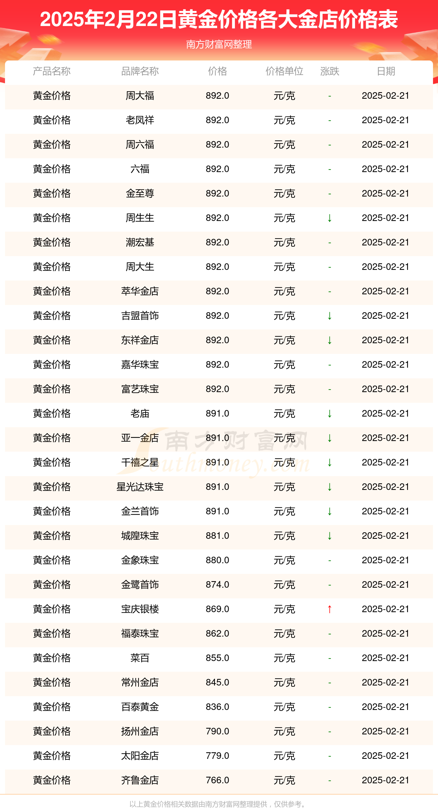 今天是2025年2月22日,周大福、老凤祥、周六福、六福、菜百、老庙、金至尊、周生生、潮宏基、周大生、宝庆银楼等各大金店品牌黄金价格最新价格如下:周大福892.0元/克、老凤祥892.0元/克、周六福892.0元/克、六福892.0元/克、菜百855.0元/克、老庙891.0元/克、金至尊892.0元/克、周生生892.0元/克、潮宏基892.0元/克、周大生892.0元/克、宝庆银楼869.0元/克。